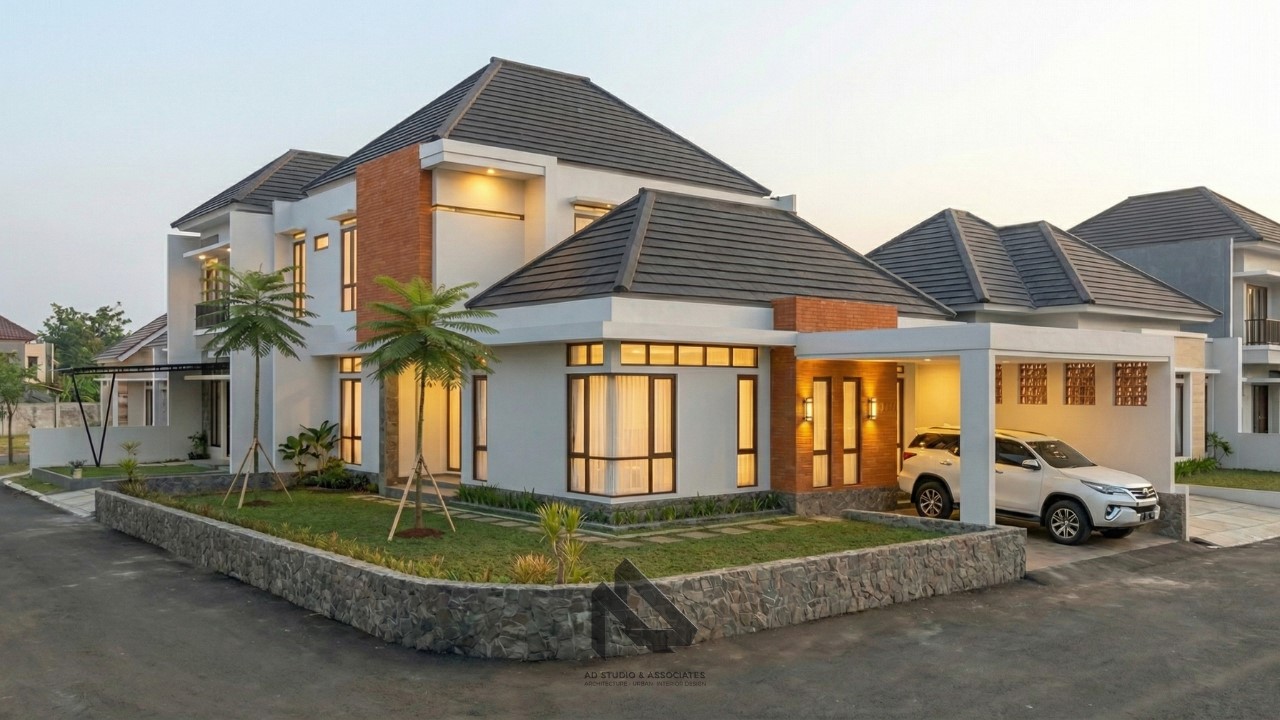 Fasad menentukan kesan pertama sekaligus memengaruhi nilai jual. Pada atap limas rumah modern, kombinasi berikut sering digunakan: