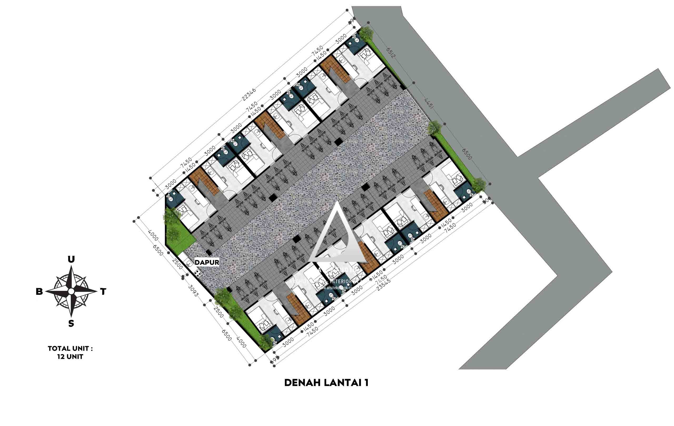 Lantai 1: 5-6 kamar, dapur bersama, ruang santai, dan kamar mandi bersama.