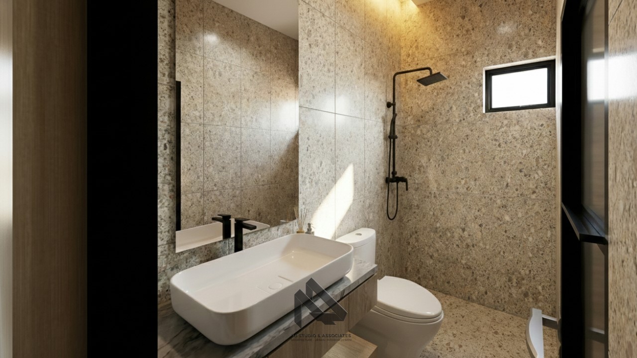 Kamar mandi adalah area yang rentan licin. Oleh karena itu, desain bertujuan untuk meminimalkan risiko kecelakaan dengan penggunaan material anti slip dan tata letak yang aman.