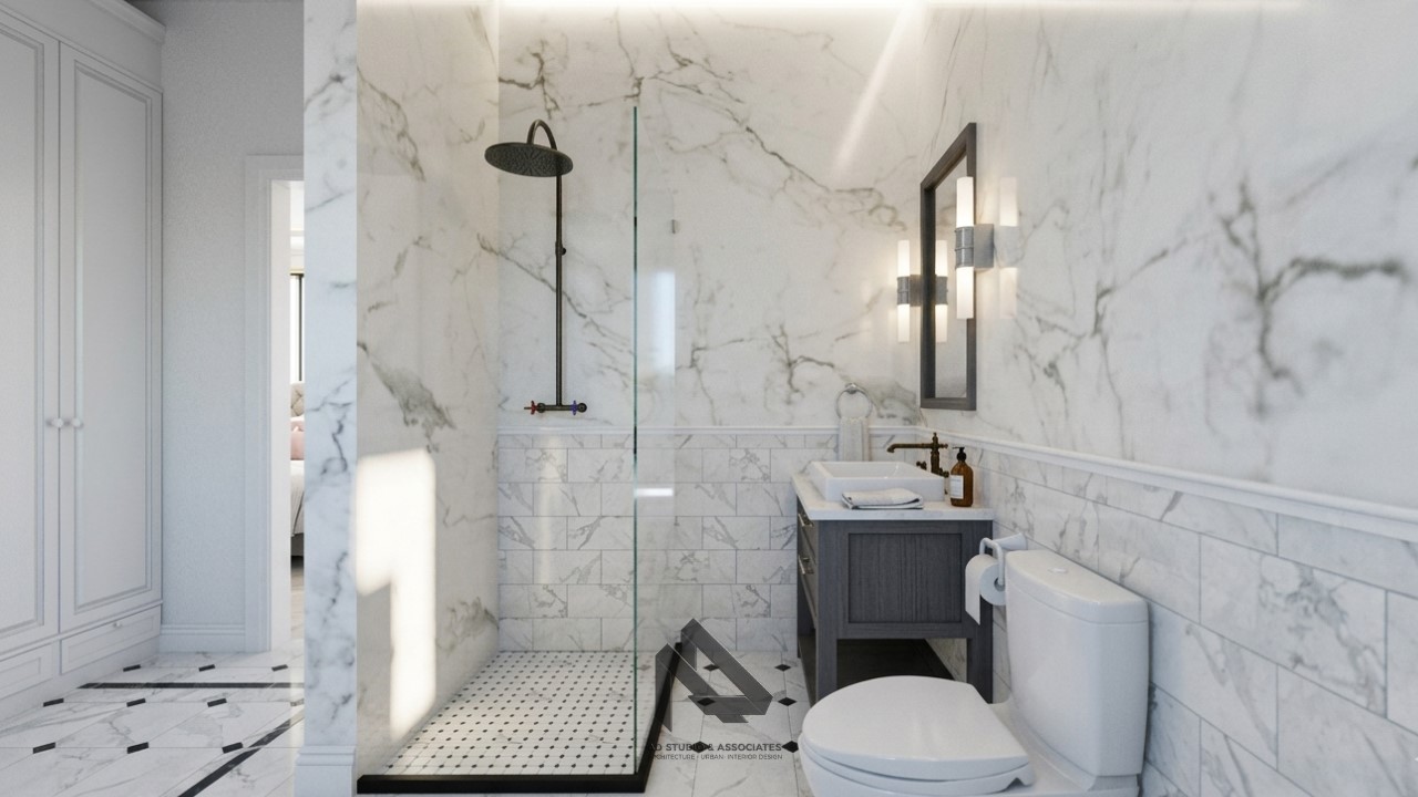 Penempatan toilet, wastafel, dan shower harus efisien agar ruang tidak terasa sempit.