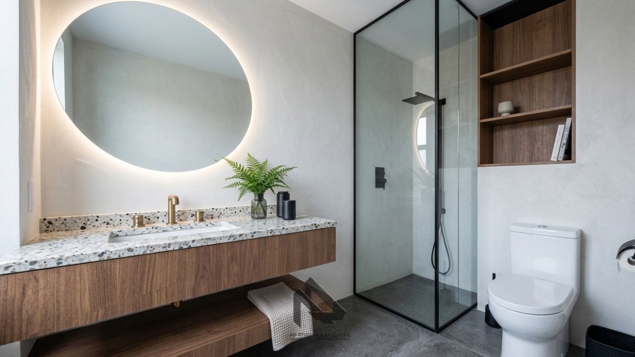 Desain modern menonjolkan garis tegas, material premium, dan teknologi seperti shower digital.