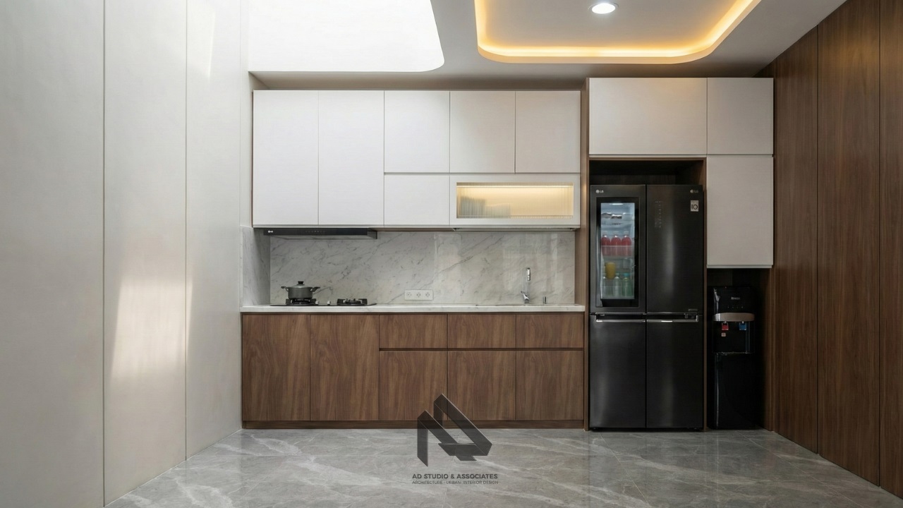 Material kayu atau motif kayu digunakan untuk menambah kesan hangat.