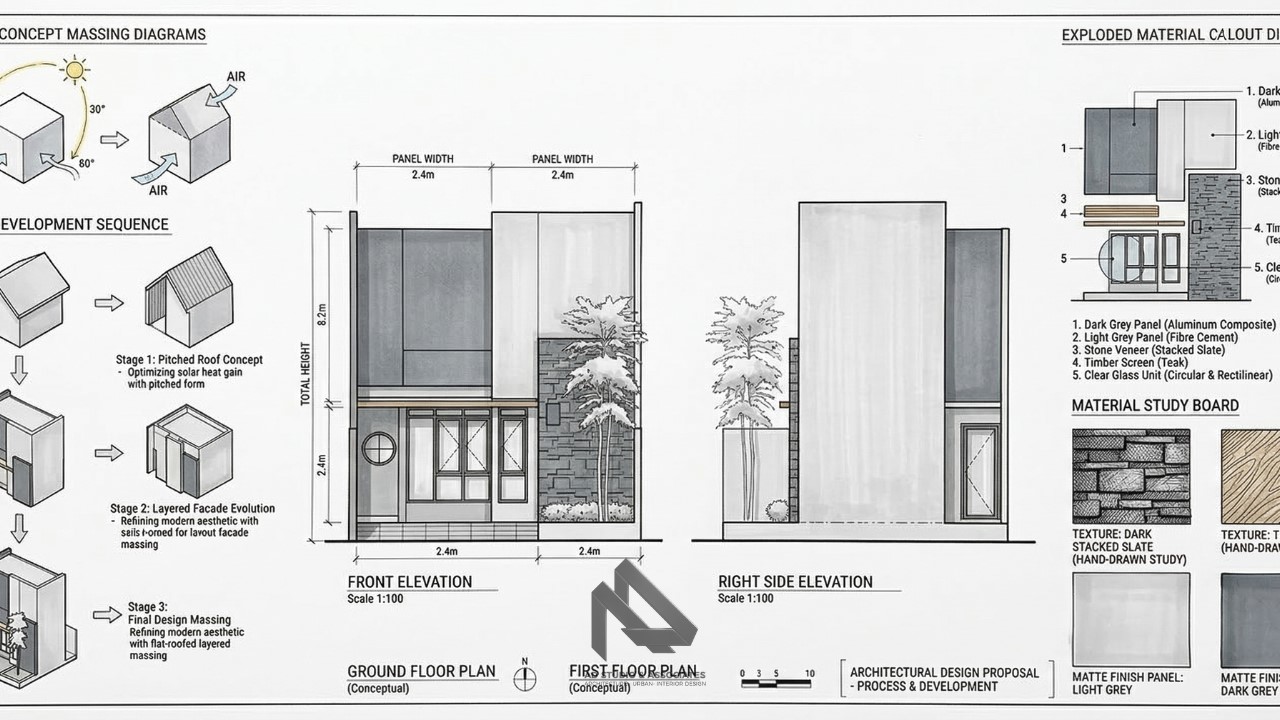 Material fasad sangat memengaruhi tampilan dan karakter rumah. Dalam desain rumah 1 lantai minimalis, pemilihan material harus seimbang antara estetika dan biaya.
