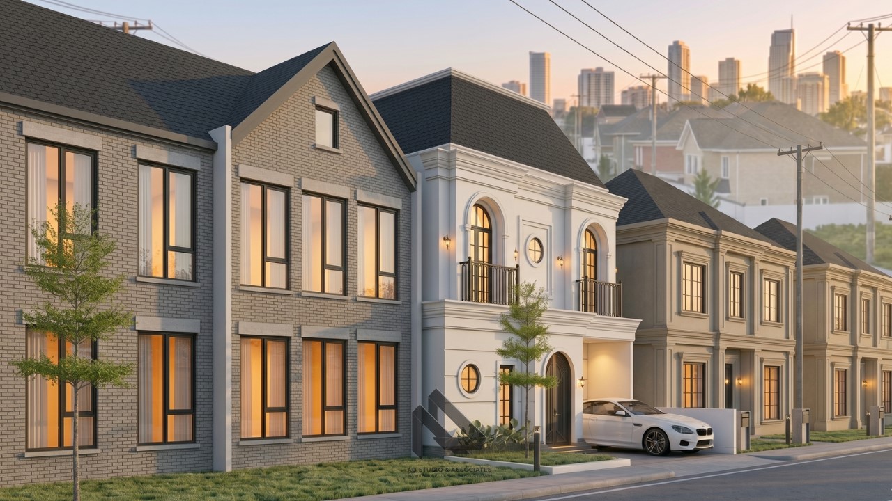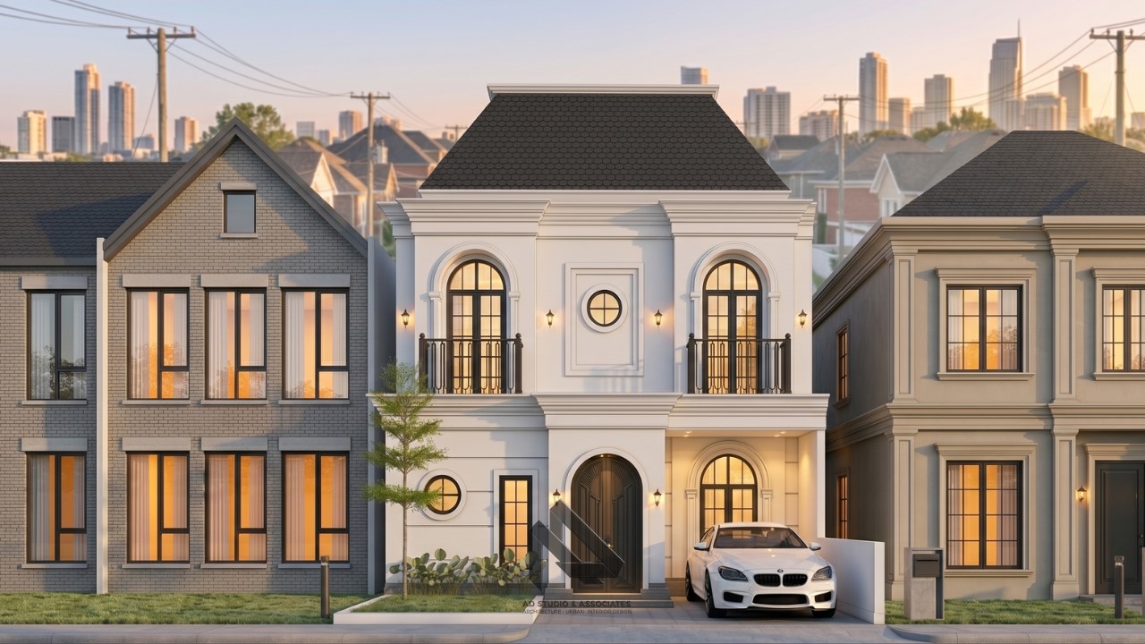 Fasad adalah elemen paling penting dalam rumah klasik. Pada lahan 8×9, desain fasad harus dibuat proporsional agar tidak terlihat terlalu padat.
