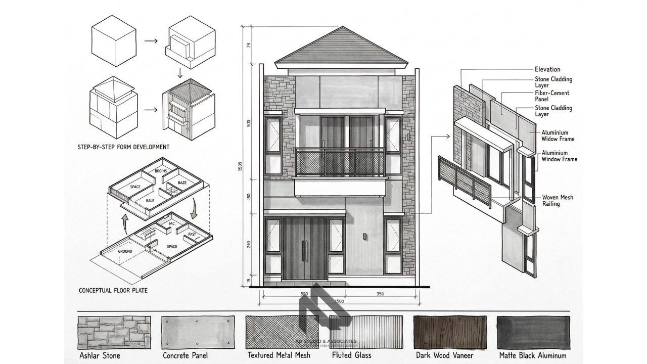 Fasad menjadi elemen pertama yang mencerminkan karakter rumah minimalis. Desain oleh jasa arsitek rumah minimalis menonjolkan garis tegas, bentuk geometris sederhana, serta penggunaan warna netral seperti putih, abu-abu, atau beige. Aksen material seperti kayu, batu alam, atau panel tekstur memberikan sentuhan hangat agar tampilan tidak monoton. Komposisi jendela dirancang proporsional untuk memaksimalkan pencahayaan alami sekaligus menjaga privasi penghuni.