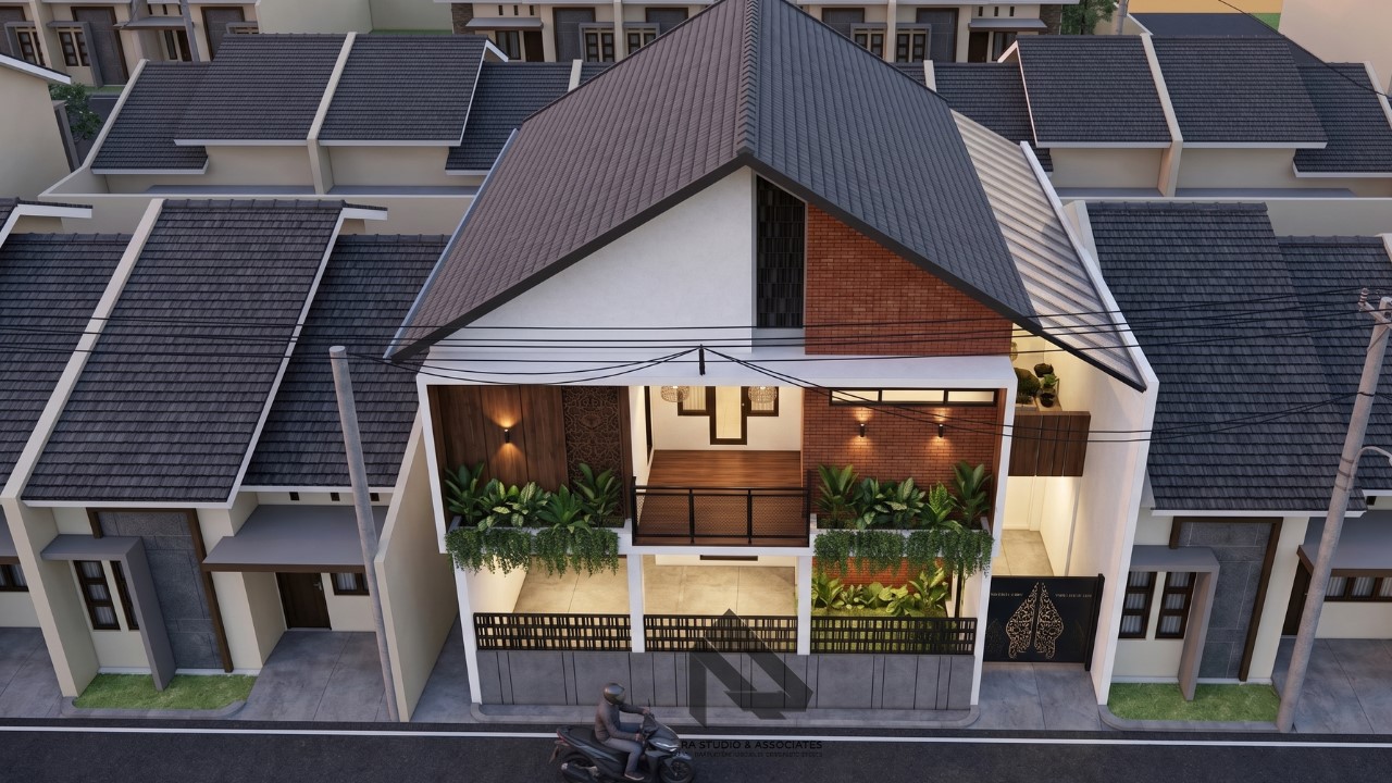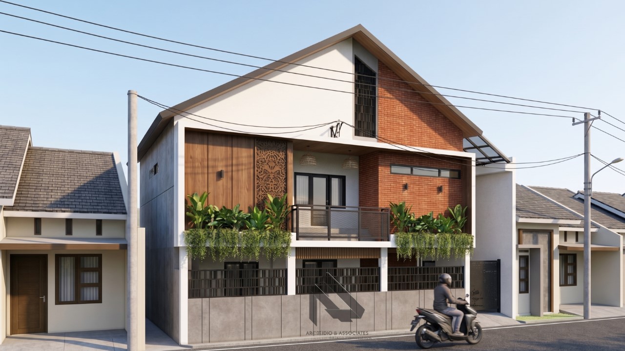 Dari tampak depan, terlihat perpaduan material seperti bata ekspos, kayu, dan dinding berwarna netral yang menciptakan kesan hangat sekaligus elegan. Atap pelana dengan kemiringan tinggi juga menjadi ciri khas rumah tropis yang berfungsi untuk mengalirkan air hujan dengan cepat serta mengurangi panas yang masuk ke dalam rumah.