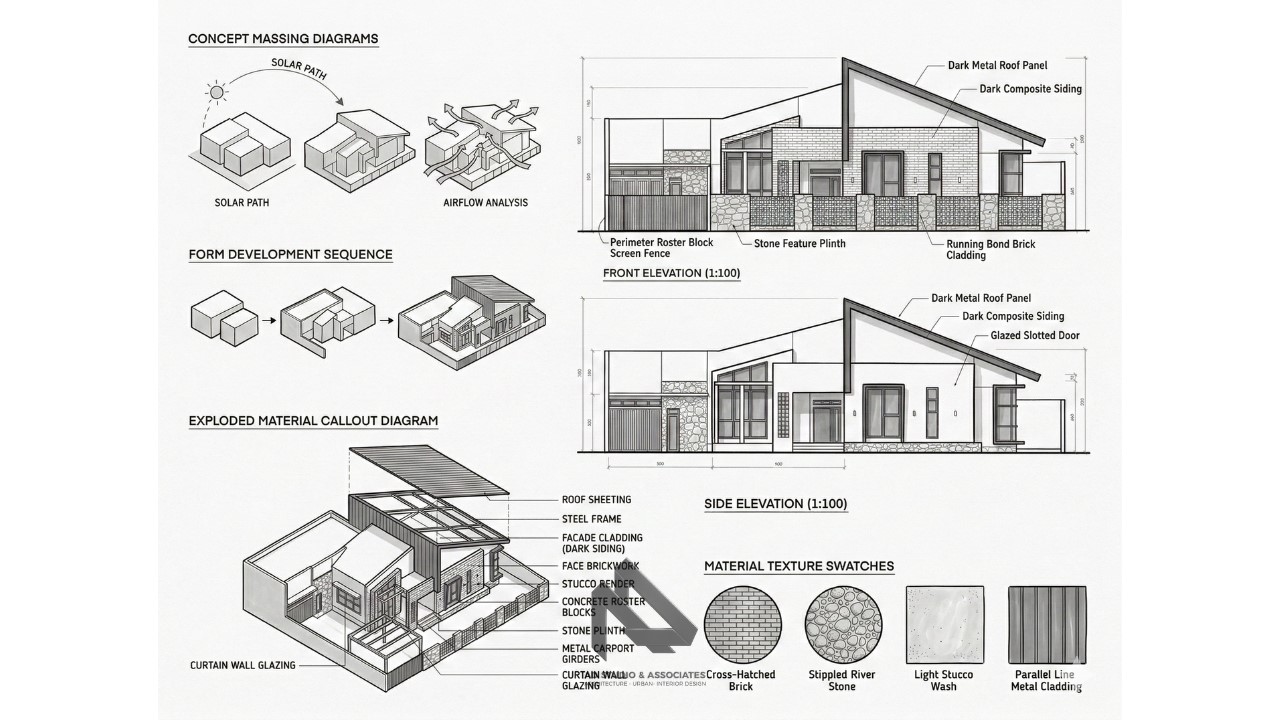 Desain fasad cenderung minimalis dengan permainan garis horizontal dan vertikal. Penggunaan material seperti beton, kayu, dan kaca sering dikombinasikan untuk menciptakan tampilan yang modern.