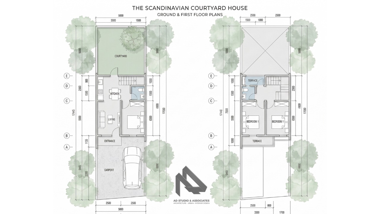 Desain rumah bergaya Skandinavian semakin populer di Indonesia dalam beberapa tahun terakhir. Gaya ini dikenal dengan tampilannya yang sederhana, bersih, dan sangat fungsional. Ciri khas utamanya adalah penggunaan warna-warna netral, bentuk bangunan yang simpel, serta pencahayaan alami yang maksimal. Rumah pada gambar ini merupakan contoh menarik dari penerapan konsep rumah Skandinavian minimalis yang dibangun di atas lahan berukuran 5 x 17 meter. Meskipun berada di lahan yang tidak terlalu luas, rumah ini tetap mampu menghadirkan kenyamanan, estetika, serta efisiensi ruang yang sangat baik.
